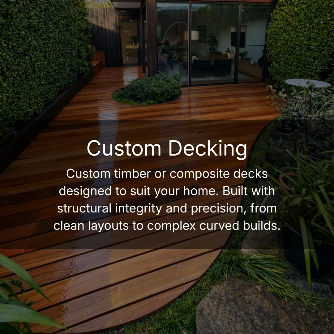 Custom timber or composite decks designed to suit your home. Built with structural integrity and precision, from clean layouts to complex curved builds.